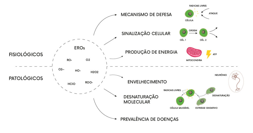 Contudo, quando há excesso na produção de EROs ou deficiência nos mecanismos antioxidantes fisiológicos, ocorre um estado conhecido como estresse oxidativo, caracterizado pelo acúmulo excessivo de radicais livres. Esse acúmulo pode causar diversos tipos de danos, como: