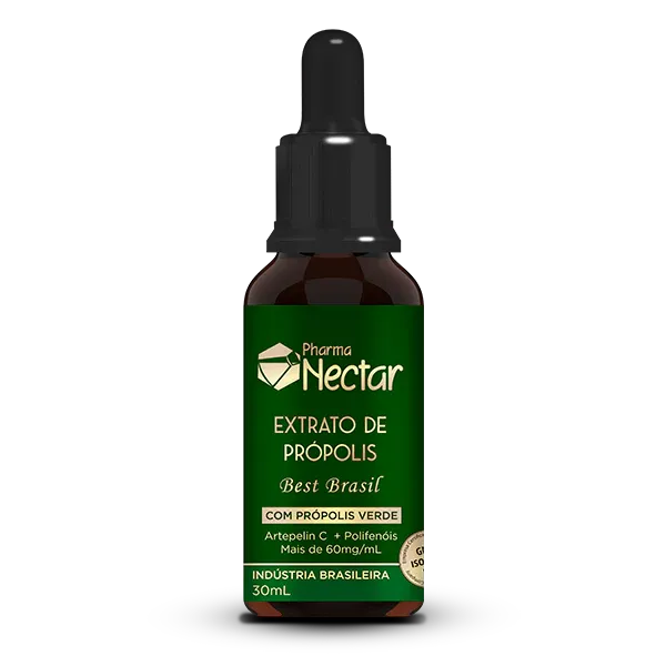Extrato de Própolis Verde Pharmanectar é rico em compostos fenólicos, como os flavonoides e o artepelin C, que são os responsáveis pelas ações anti-inflamatórias, antivirais, antimicrobianas e cicatrizantes da própolis verde.